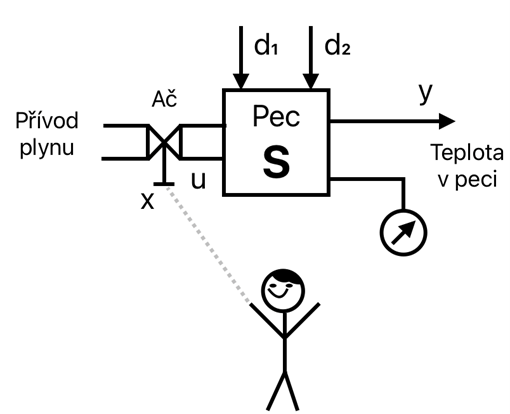 • [x] – Regulovaná veličina – Jedná se o vstupní veličinu do regulátoru. Upravována podle daných podmínek (hladiny vody, teploty v peci).