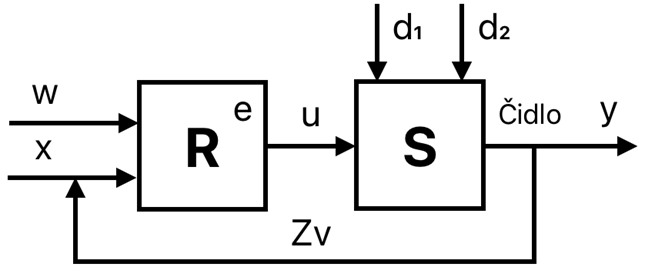 5. Řízený systém je ovlivněn jak akční veličinou, tak poruchami d1, d2.